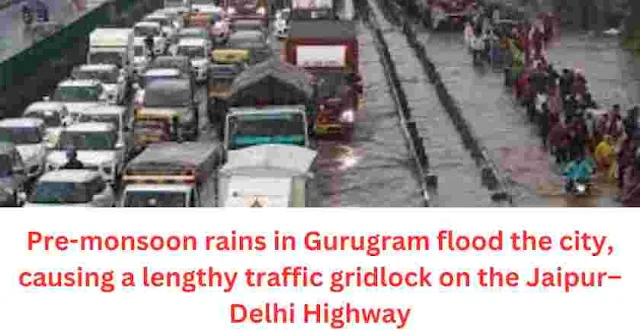 Pre-monsoon rains in Gurugram flood the city, causing a lengthy traffic gridlock on the Jaipur–Delhi Highway